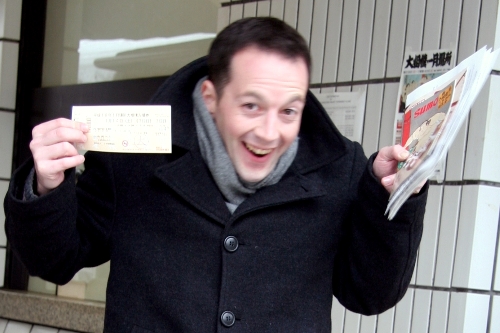 Nachdem mir Sumo im letzten Jahr schon so gut gefallen hat, musste ich natuerlich wieder dort hin! Das da rechts bin ich mit den Eintrittskarten und Anleitungs-Prospekten. Beim Klick darauf geht's zu den Bildern.