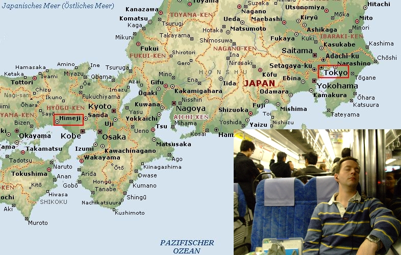 Mittags ging es dann nach der Schule zum Bahnhof Shinagawa, wo ich mich mit Olli und Dominik getroffen habe, um das Grossabenteuer Himeji anzugehen. Grossabenteuer deshalb, da wir mit den sehr guenstigen Tickets nicht die schnellsten Zuege nehmen konnten. Wir haben nach etwas ueber 10 Stunden Zugfahrt und ca. 4 Mal Umsteigen die rund 640 km nach Himeji gut hinter uns gebracht. Auf der Fahrt sind wir durch Shizuoka, Nagoya, Kobe, Kyoto, Osaka und einige andere interessante Orte gekommen. Schoene Bahnhoefe! Und da einige der Zuege, in denen wir teilweise zweieinhalb Stunden sitzen durften, keine Toiletten hatten, mussten wir auch mal aussteigen. Nach der ersten dieser Aktionen gab es einfach nichts mehr zu trinken.